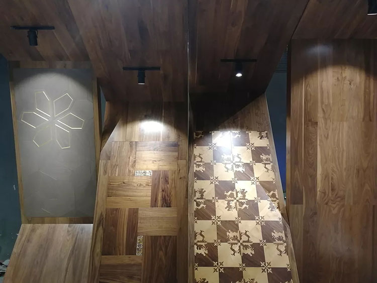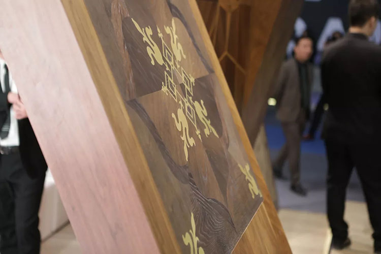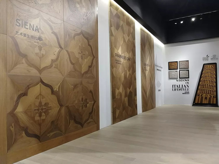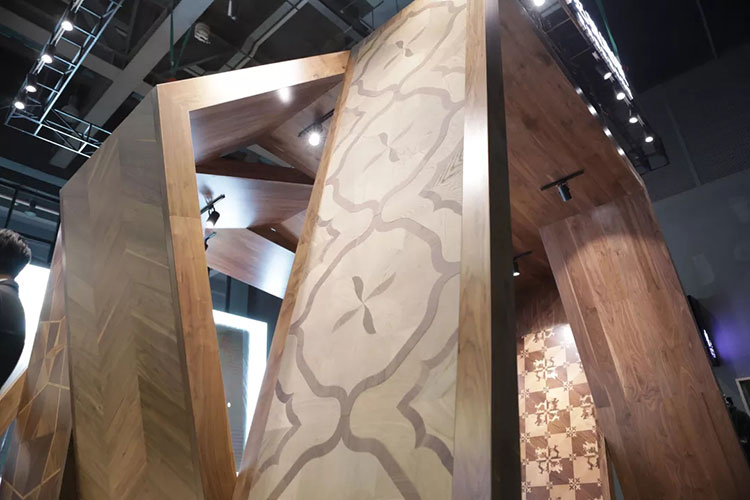 展廳的論壇區以拱門優先搶占視覺先機,這4大造型各異的拱門全部由意大利菲列德羅的地板搭建而成,花朵般的AZALEA拼花、幾何拼接的MIRAGGI拼花、金木結合的FENICE金屬拼花以及如同荷葉般的VENTAGLIO拼花、金磚地板等純手工拼花地板以絢爛的姿態直面觀眾。