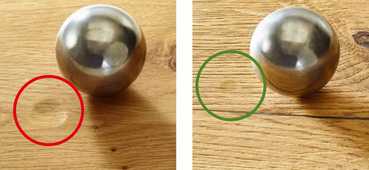 實驗室的對比測試清晰標明:一個金屬球以4000牛頓的壓力掉落,在標準的實木復合地板上留下了一個清晰可見的凹痕,而在必美寬綽科技地板上面幾乎看不到任何痕跡。