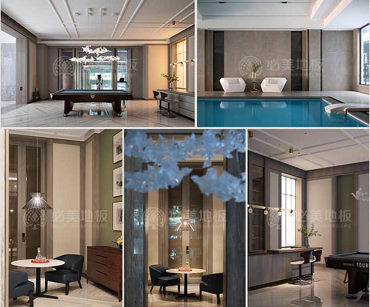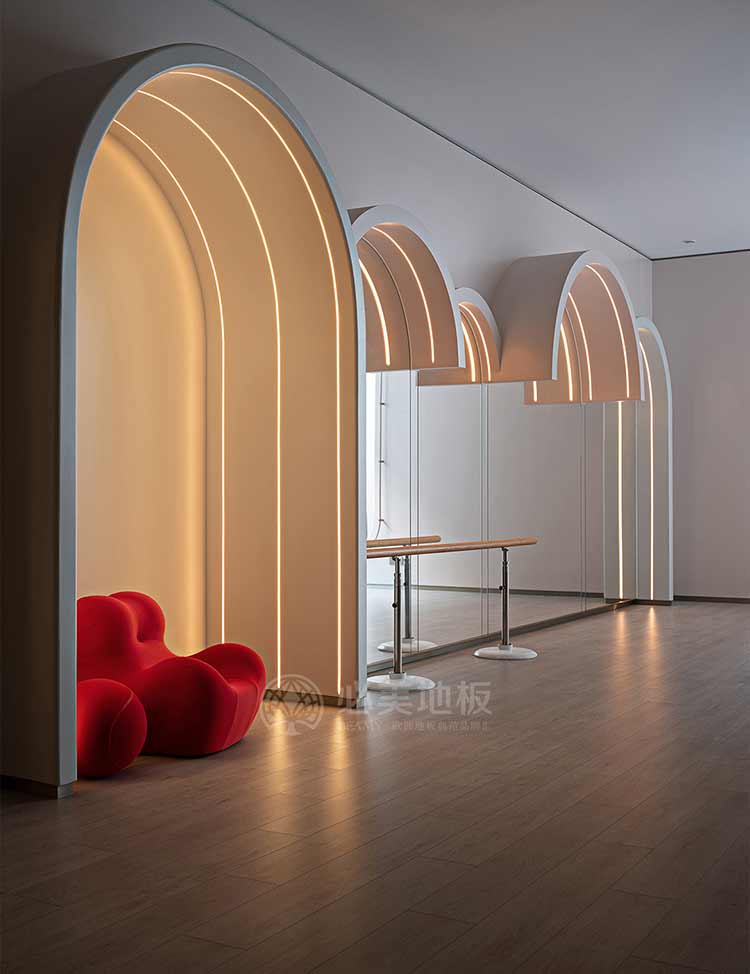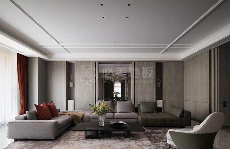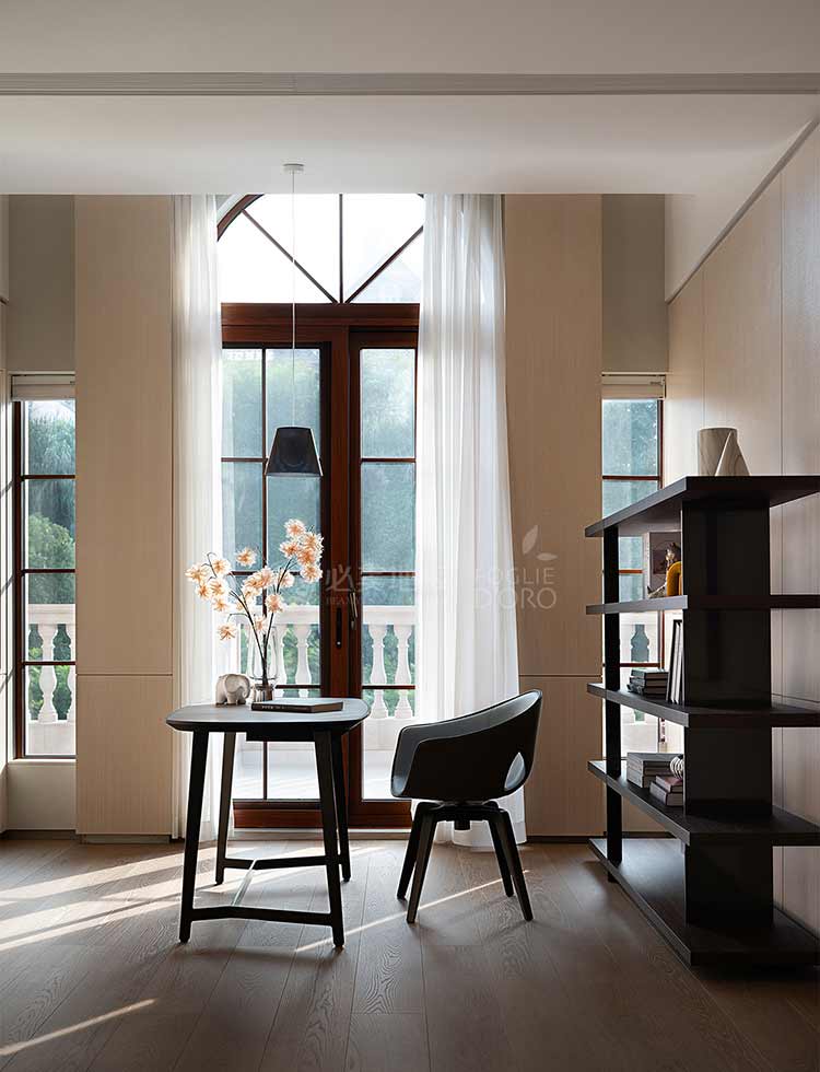 設計在休憩空間更為克制,整體質感的體現通過細節的雕琢來呈現。大面的低飽和設色,給人以靜謐放松的空間感受;張弛有度的線條浸入其中,詮釋居住的美學范式;奢適的尺度容納生活需求,大開窗將光與景的變化全盤收藏。無論是從美學還是功能角度來看,必美菲列德羅巴塞吉奧木地板都是這個空間不可或缺的一部分。