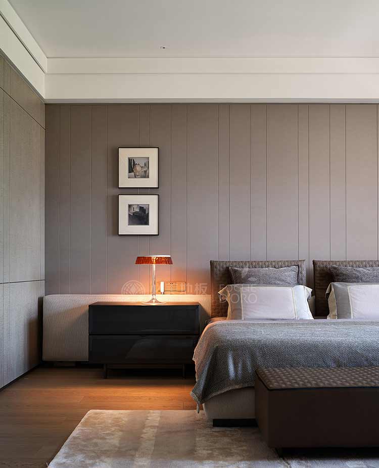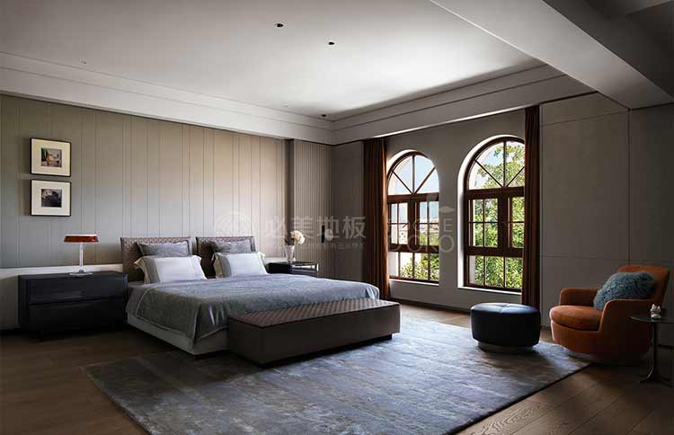 基于空間場景的整體打造,臥室的功能不僅僅考慮居住功能,設計希望臥室也可以像酒店套房一樣成為可以自在休憩的空間。在這間臥室的設計中,必美菲列德羅巴塞吉奧橡木地板成為整個空間的焦點。