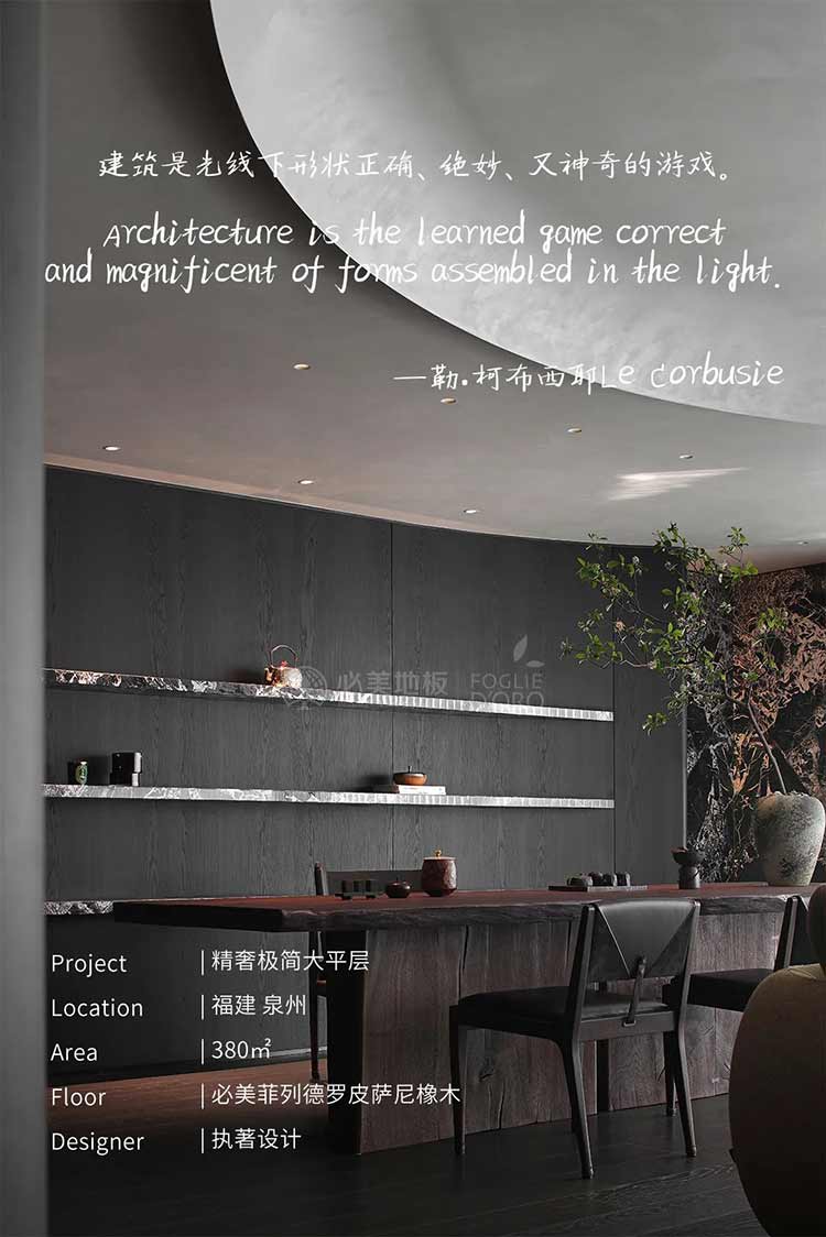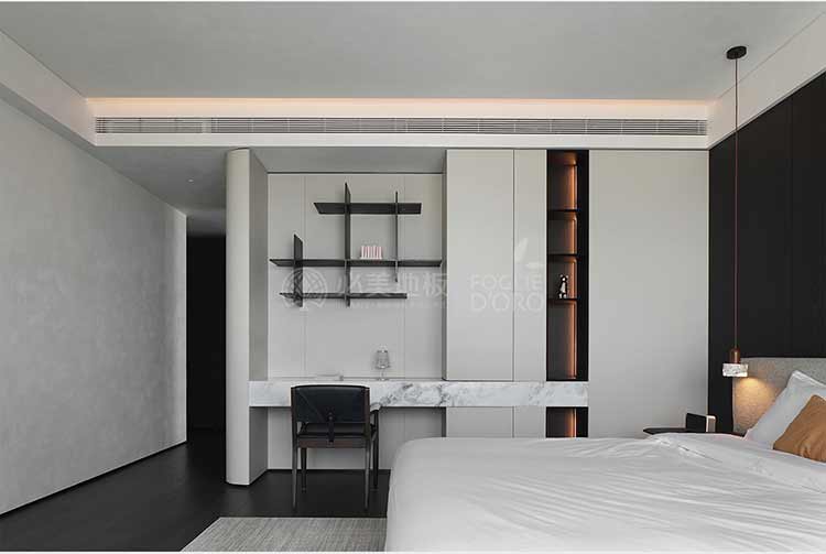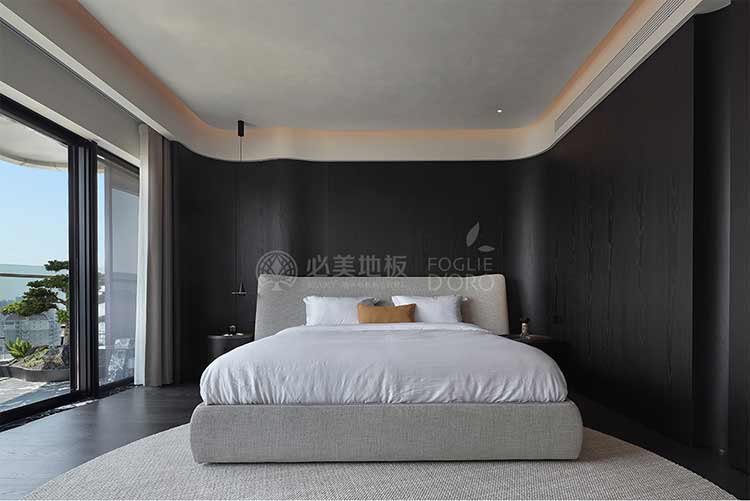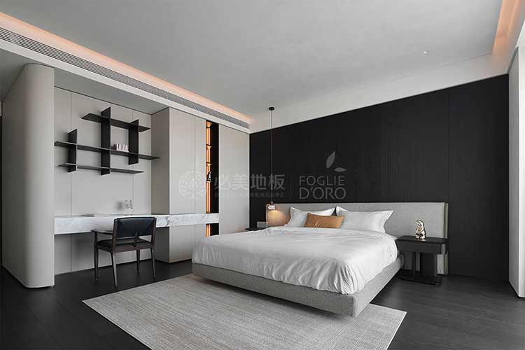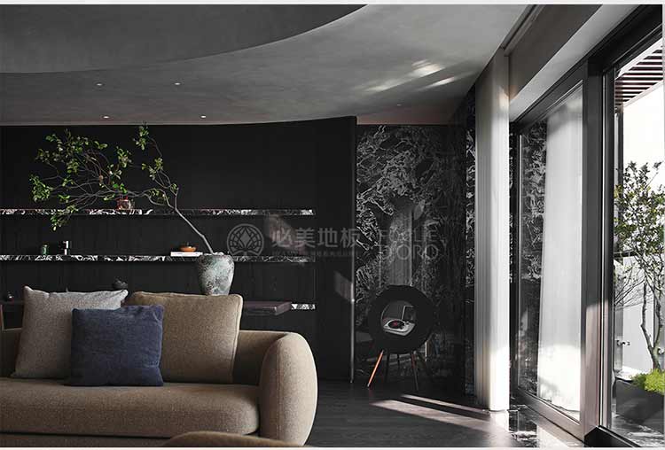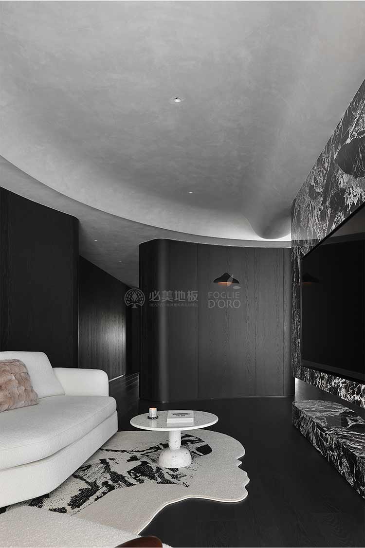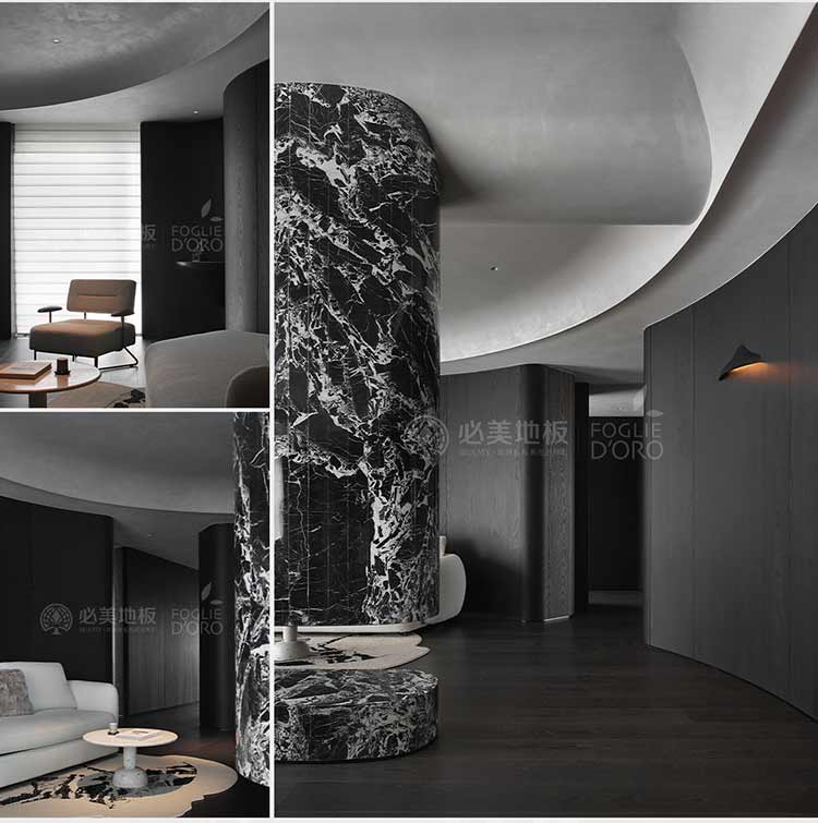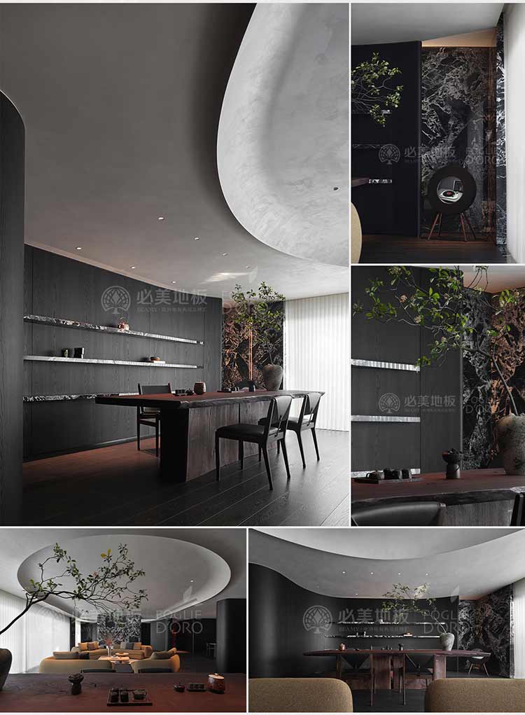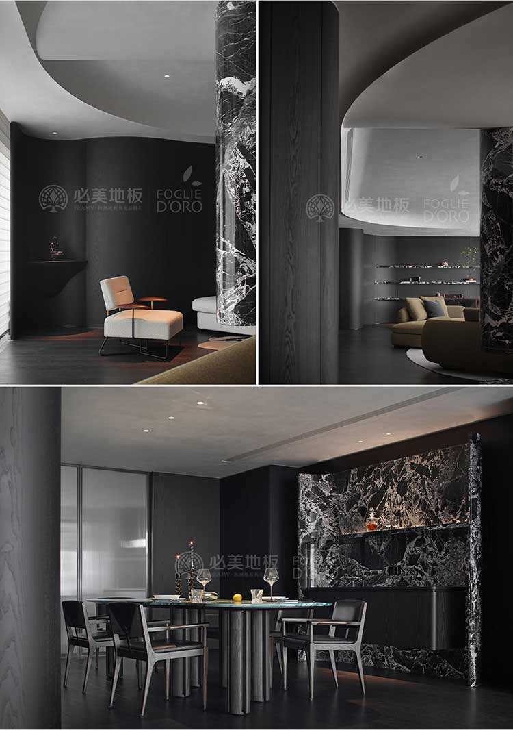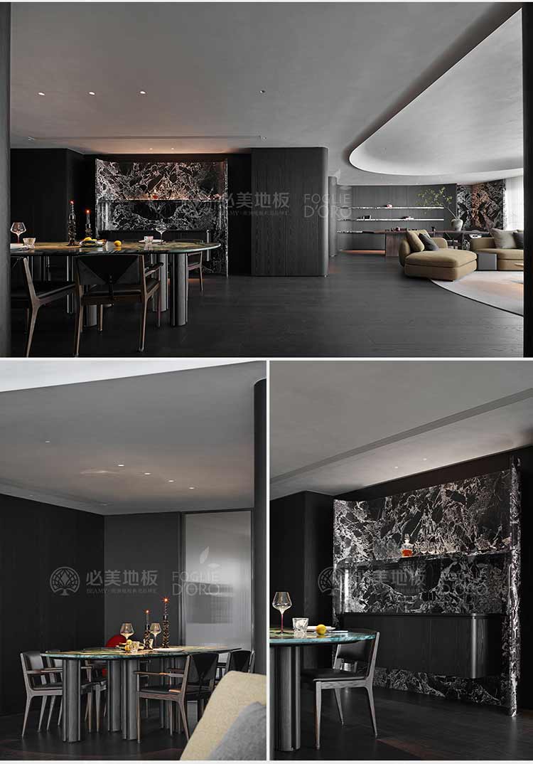 整個空間的視覺調(diào)性偏深邃的質(zhì)感暗調(diào),從軟裝、墻面家具陳設到地板,視覺達到了極度的高頻統(tǒng)一。必美菲列德羅皮薩尼橡木地板是通過手工雕刻、清漆染色,增加了木材的自然特性,讓空間通過光與材質(zhì)肌理的關(guān)系,明暗色彩的有效點綴,藝術(shù)家具化的主調(diào)形式,表達出空間的和諧與純粹感。