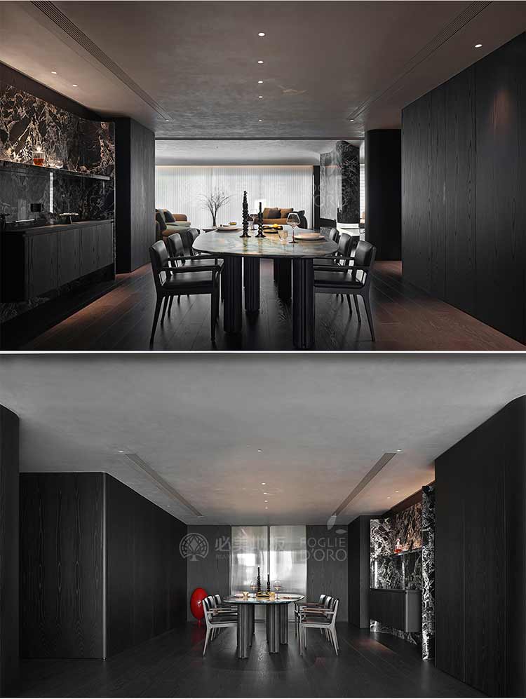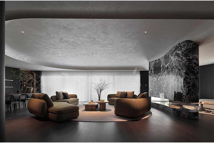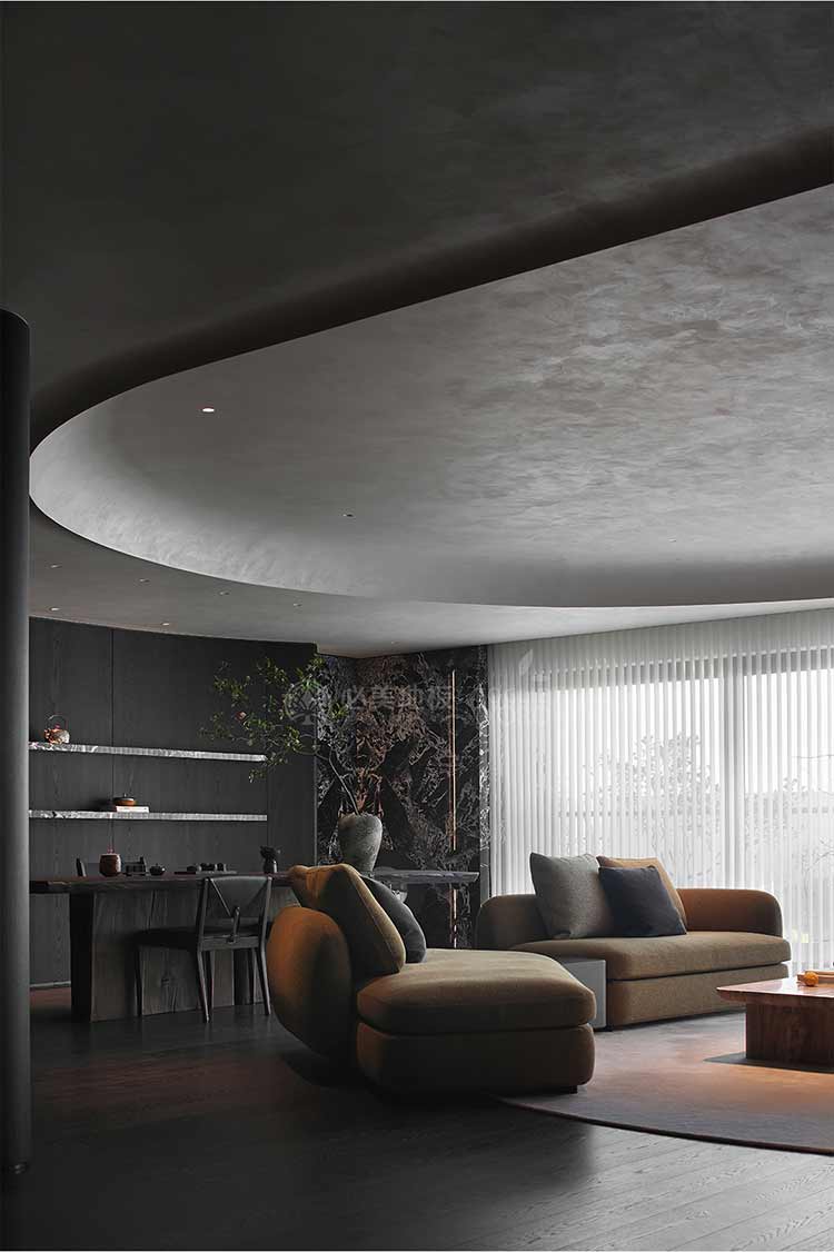 全屋設計以“隱于形的詩意”為核心,通過精心策劃,打破了線性空間的固有邏輯,于蜿蜒的曲線形態(tài)與深色空間畫布中,締造出明朗大氣、優(yōu)雅靜謐的氛圍感。